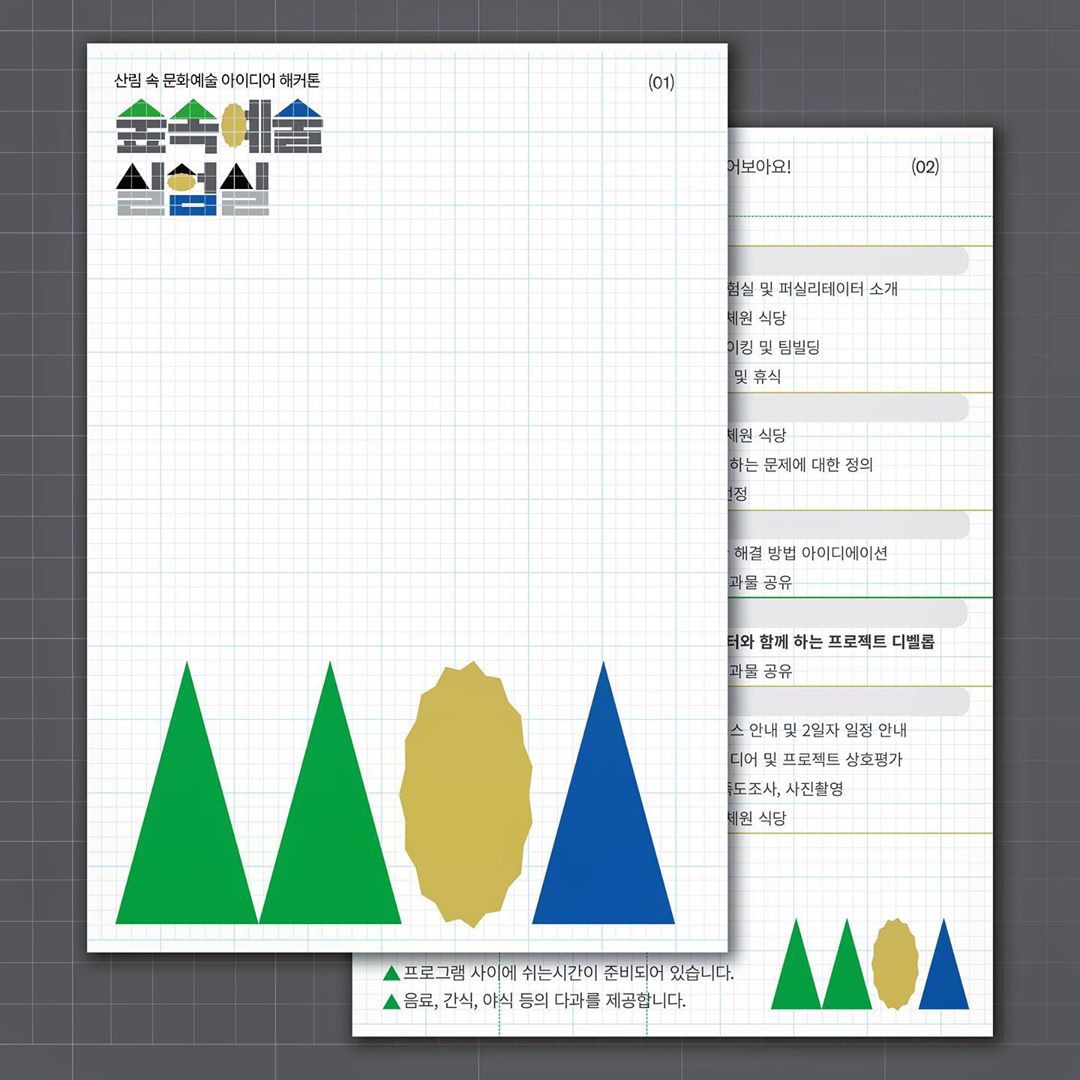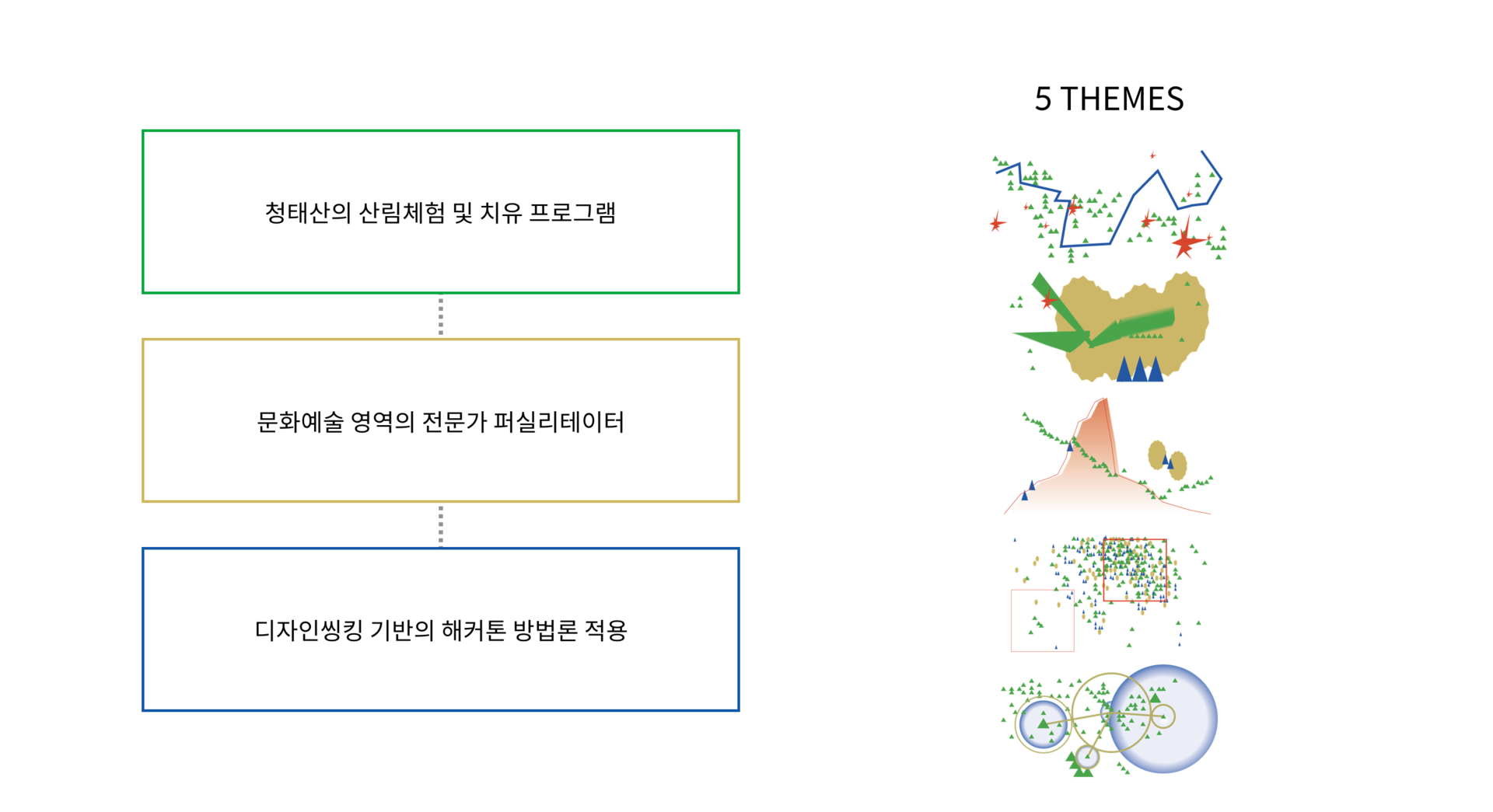 국내 제1의 산림도인 강원도의 산림자원은 기후변화에 따른 산림의 공익적 기능이 증가하고 있다. 뿐만 아니라 강원이 가진 특권적 자연환경이 웰니스, 휴양, 교육. 문화예술, 치유, 산림경험 등 다양한 프로그램과의 연계 가능성이 열려있음. 강원문화재단의 해커톤 프로그램은 단순한 아이디어 해커톤의 방식이 아닌. 강원이 가진 자원을 활용한 특화형 문화예술 해커톤의 방식으로 구성하여 '숲속예술실험실'이라는 숲 체험과 해커톤은 함께 연계하여 진행하고자 했습니다. 이에 따라 청태산 자락의 국립횡성숲체원을 해커톤 사이트로 정하고 숲체원 프로그램과 함께 팀 빌딩을 진행하였고, 숲 안에서 새로운 문화예술 프로젝트 아이디에이션을 진행할 수 있는 다양한 방법론과 워크샵을 진행하였습니다. 전체 프로그램은 참여자와 퍼실리테이터의 다양성을 고려해 5개의 주제로 구성하였고 디자인씽킹 방법론을 문화예술 아이디이에이션에 접목하여 해커톤을 진행하였습니다.